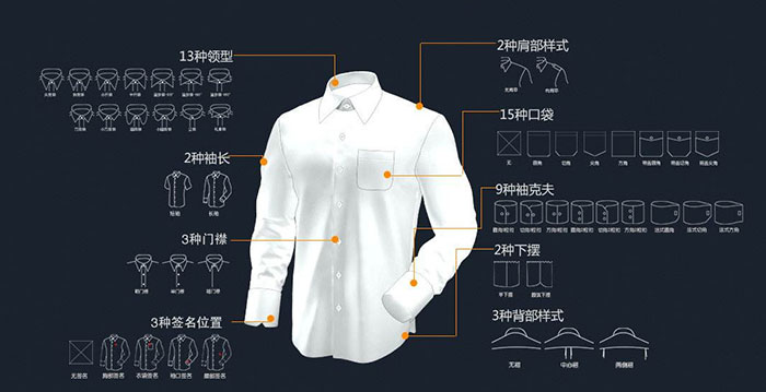 定制襯衫可以自行選擇自己喜歡或所需的面料,款式也可以進(jìn)行任意的設(shè)計(jì),紐扣、門襟、袖扣等都可以按要求制作。