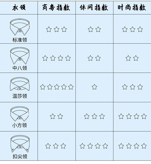 襯衫的最常見的領(lǐng)型一般有標準領(lǐng)、中八領(lǐng)、溫莎領(lǐng)、小方領(lǐng)、扣尖領(lǐng)。