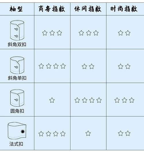 襯衫的袖型也是考驗定制的靈魂,最常見的袖型一般有斜角雙扣、斜角單扣、圓角單扣還有法式扣。