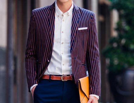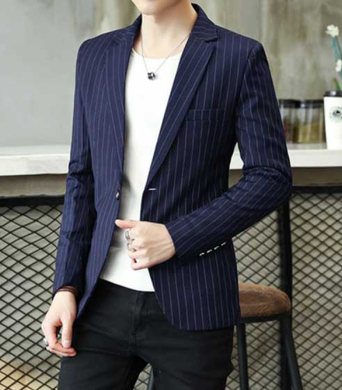 1、條紋西裝在穿搭時可以選擇單品外套+休閑牛仔黑色褲子,上身內(nèi)搭T恤,鞋子可以搭配卡其色的休息板鞋,這種穿搭比較適合年輕男士,不但顯得休閑,更給人一種時尚的氣息,對于酷愛時尚的你,不妨可以試試這樣的穿搭。