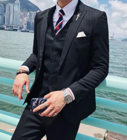 3、一整套條紋西裝+白色襯衫+領(lǐng)帶+胸針,這種穿搭永遠(yuǎn)經(jīng)典,不會過時,這種穿搭可以出席任何的正式場合,一整套出場可以給大家一種非常可靠穩(wěn)重的感覺,同時也給人一種非常有男性魅力和充滿自信的感覺。