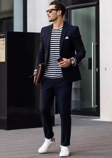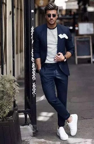 我們都知道西裝一般搭配的是皮鞋,這樣會顯得比較正式、紳士。而選擇小白鞋作為搭配,年輕感則比皮鞋要來得強(qiáng)烈一些。西裝搭配小白鞋同樣顯年輕時尚感,一再打破傳統(tǒng)的西裝搭配。